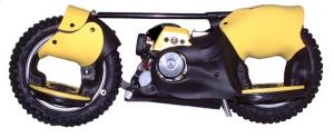 A center mounted engine and frame, supported at each end by a spokeless wheel into which feet can be inserted while standing upright. The new Wheelman has a 43cc/49cc 2 stroke engine which takes a mix of oil and gas just like a lawnmower or weed whacker. It holds around one liter of fuel and will give you a ride time of over half an hour.